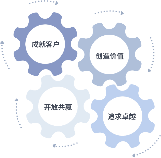 成就客户是一切决策的出发点,,,,创造价值是衡量所有工作的标准,,,,追求卓越是我们做事做人的态度,,,开放共赢是我们的格局也是最终的结果。。价值观的齿轮环环相扣,,,,推动着组织里的每个人不断向前。。