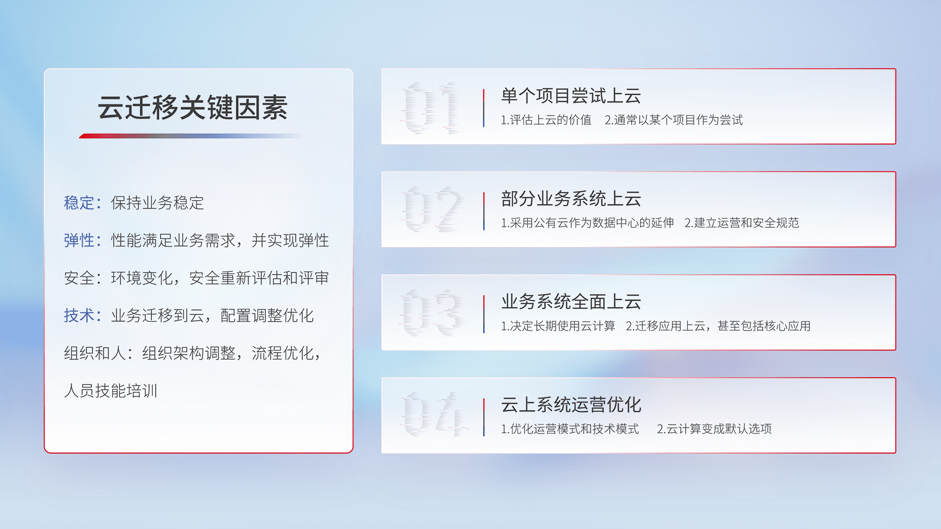 结合实际业务,,,,从规划设计、、云平台选型、、、、云原生改造、、数据迁移、、、集成交付,,,迁移全过程为客户识别最佳上云路径,,,,做好风险识别管理,,,设计网络架构、、、身份权限、、安全审计合规、、操作审计、、日志审计、、、监控告警策略、、、多站点容灾设计等,,,对云上基础设施进行整体规划,,,提升IT治理水平,,,以满足弹性、、、高可用、、高性能的需求。。。